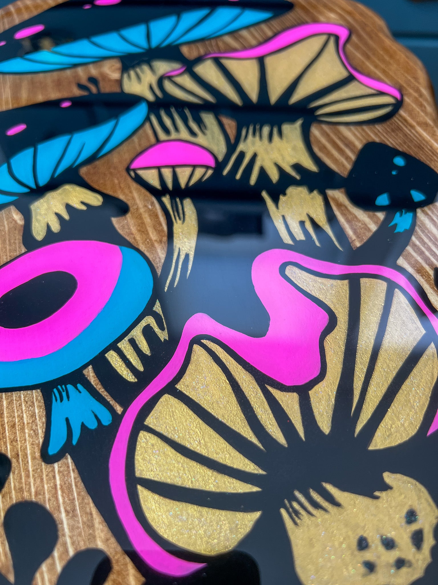 This handcrafted mushroom table is a functional art piece designed to live comfortably between sculpture and furniture. Each table is individually cut, shaped, hand-painted, and sealed beneath a high-gloss resin finish that enhances the natural wood grain while protecting the artwork below.